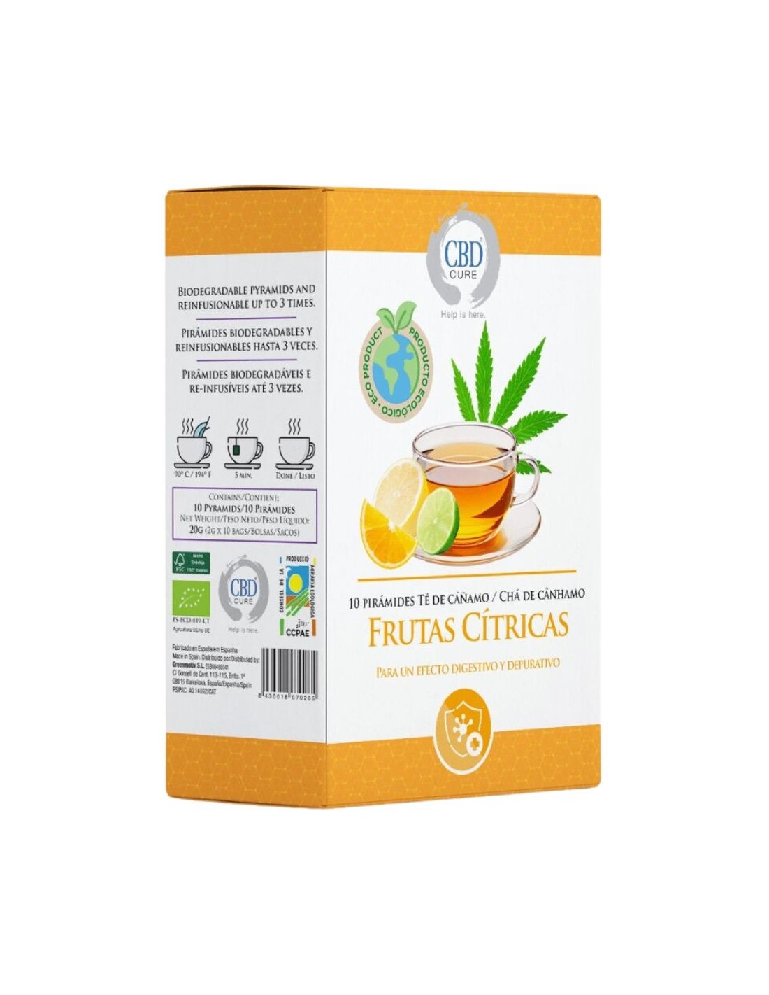 Infusion de chanvre et d'agrumes Eco 10 pyramides CBD Cure associe la fraîcheur de l'orange et du citron aux propriétés relaxantes du chanvre. Une tisane biologique et équilibrée à déguster à tout moment de la journée.