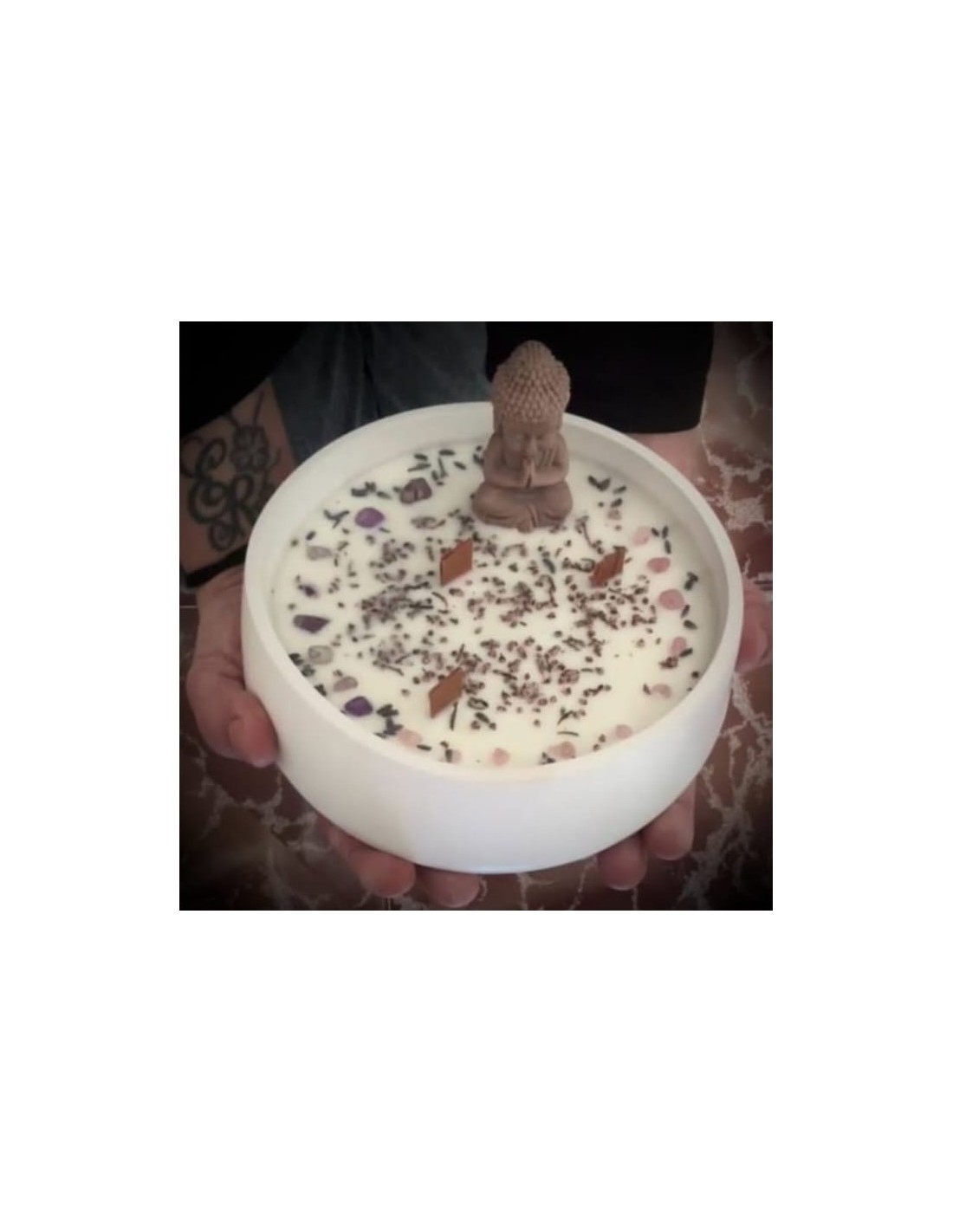 È realizzata con cera naturale e accuratamente decorata con erbe e cristalli, elementi tradizionalmente associati all'armonia e all'equilibrio energetico. Al centro si trova una figura di Buddha in posizione meditativa, simbolo di serenità, consapevolezza e connessione interiore. La candela è presentata in un contenitore fatto a mano dall'artigiano con resina ecologica, che rende ogni pezzo unico e riutilizzabile.