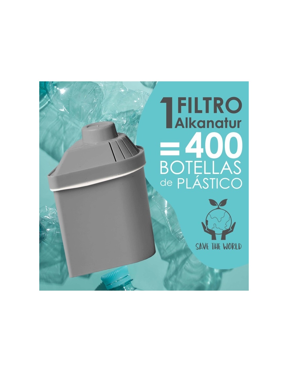 Grazie alla tecnologia Alkamicronized Selective®, questo filtro può trattare fino a 400 litri d'acqua, rimuovendo fino al 99% di cloro, fluoro, pesticidi, nitriti, trialometani e metalli pesanti come piombo, mercurio, cadmio, rame, alluminio e arsenico, rispettando i minerali naturali dell'acqua.