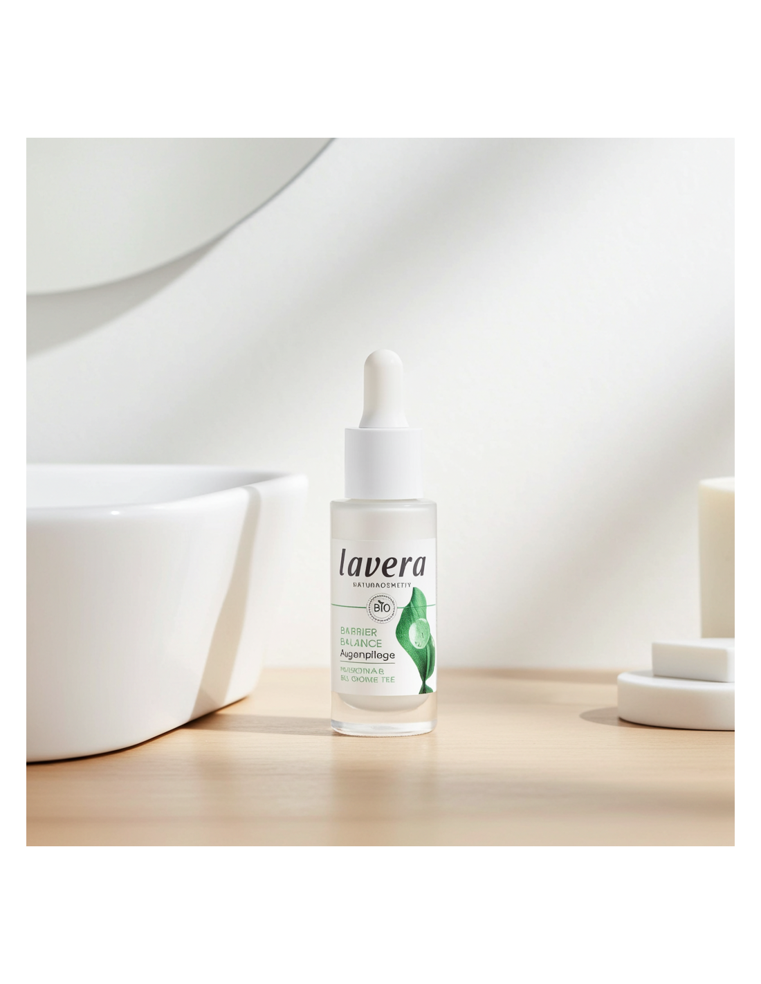 La sua formula è particolarmente adatta alle pelli sensibili, poiché non contiene alcool né profumo. Il prodotto è confezionato in vetro riciclato al 20%, a conferma dell'impegno di Lavera per la sostenibilità.