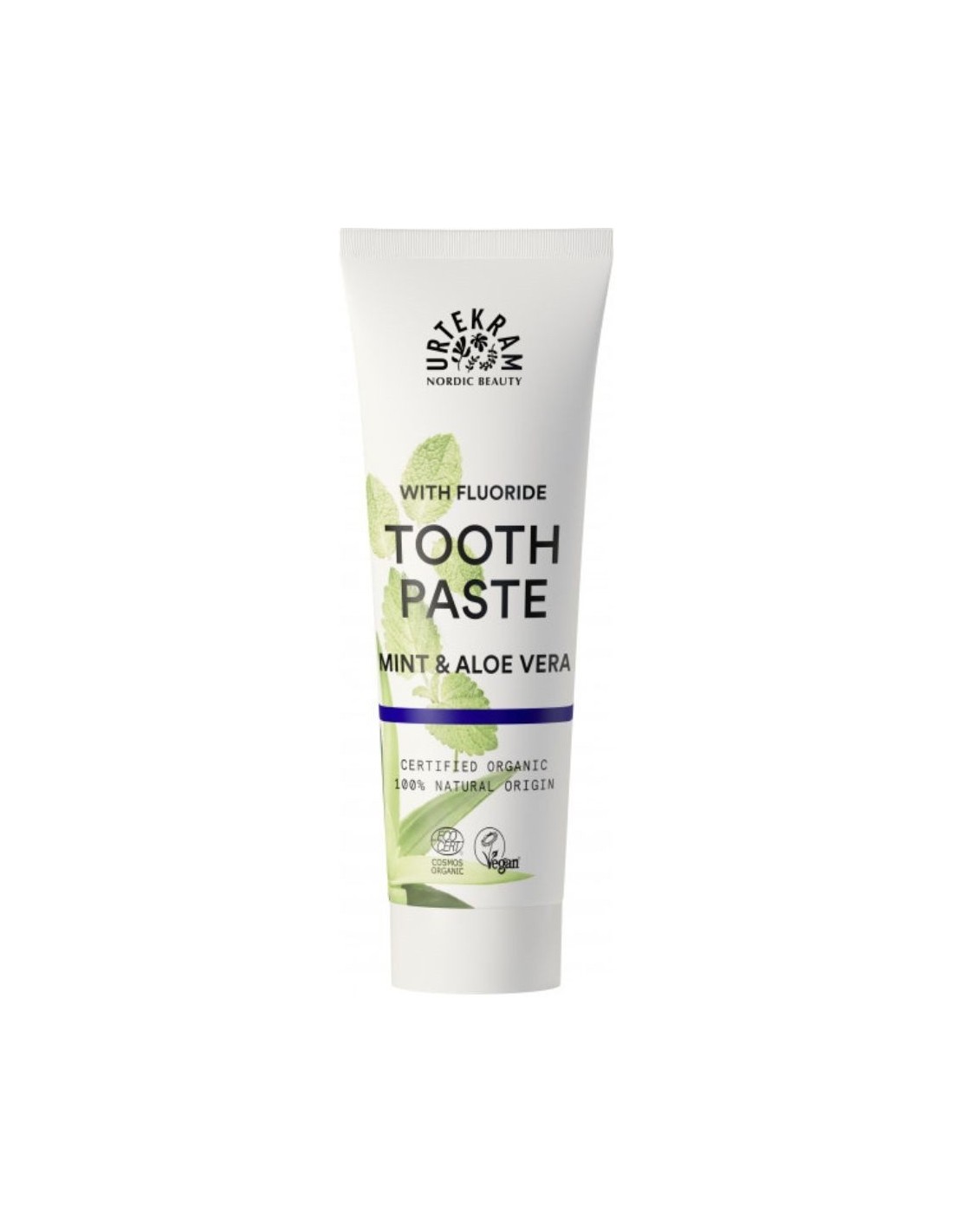 Eco Vegan Mint Aloe Fluoride Tandpasta 75ml van Urtekram is een ideale keuze voor wie op zoek is naar natuurlijke mondhygiëne met de effectiviteit van fluoride. De biologische formule, gecertificeerd onder de COSMOS Organic standaard, combineert zorgvuldig geselecteerde ingrediënten om een diepe, verfrissende en respectvolle reiniging voor tanden en tandvlees te bieden.