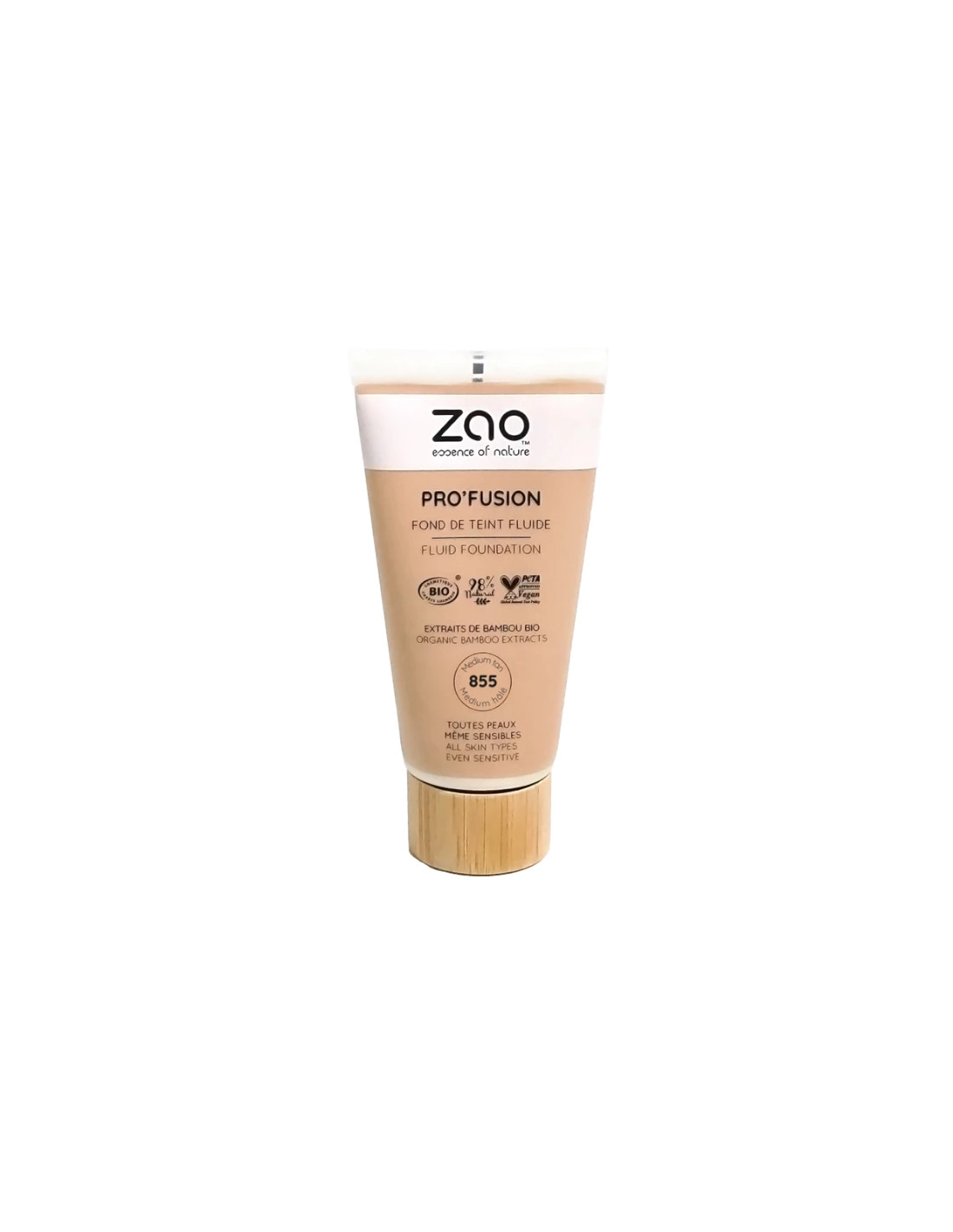 Pro'fusion ZAO 855 Medium Tan Vloeibare Make-up: biologische en veganistische basis met 98% natuurlijke ingrediënten die de teint egaliseert en een dekkende en stralende finish biedt.