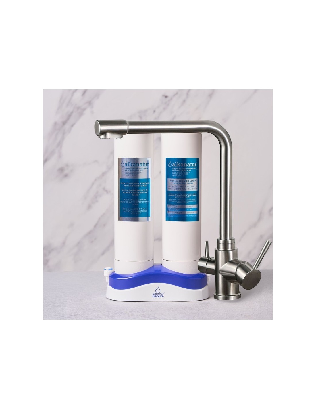 Het Alkanatur Depure ultrafiltratiesysteem voor onder het aanrecht met 3-wegkraan is ontworpen om gezuiverd water direct uit de kraan te leveren, aangepast aan de behoeften van het huis. De technologie maakt het mogelijk om leidingwater te zuiveren, te alkaliseren, te hydrogeneren en te ioniseren, magnesium toe te voegen en geherstructureerd, gevitaliseerd en hexagonaal water te genereren.