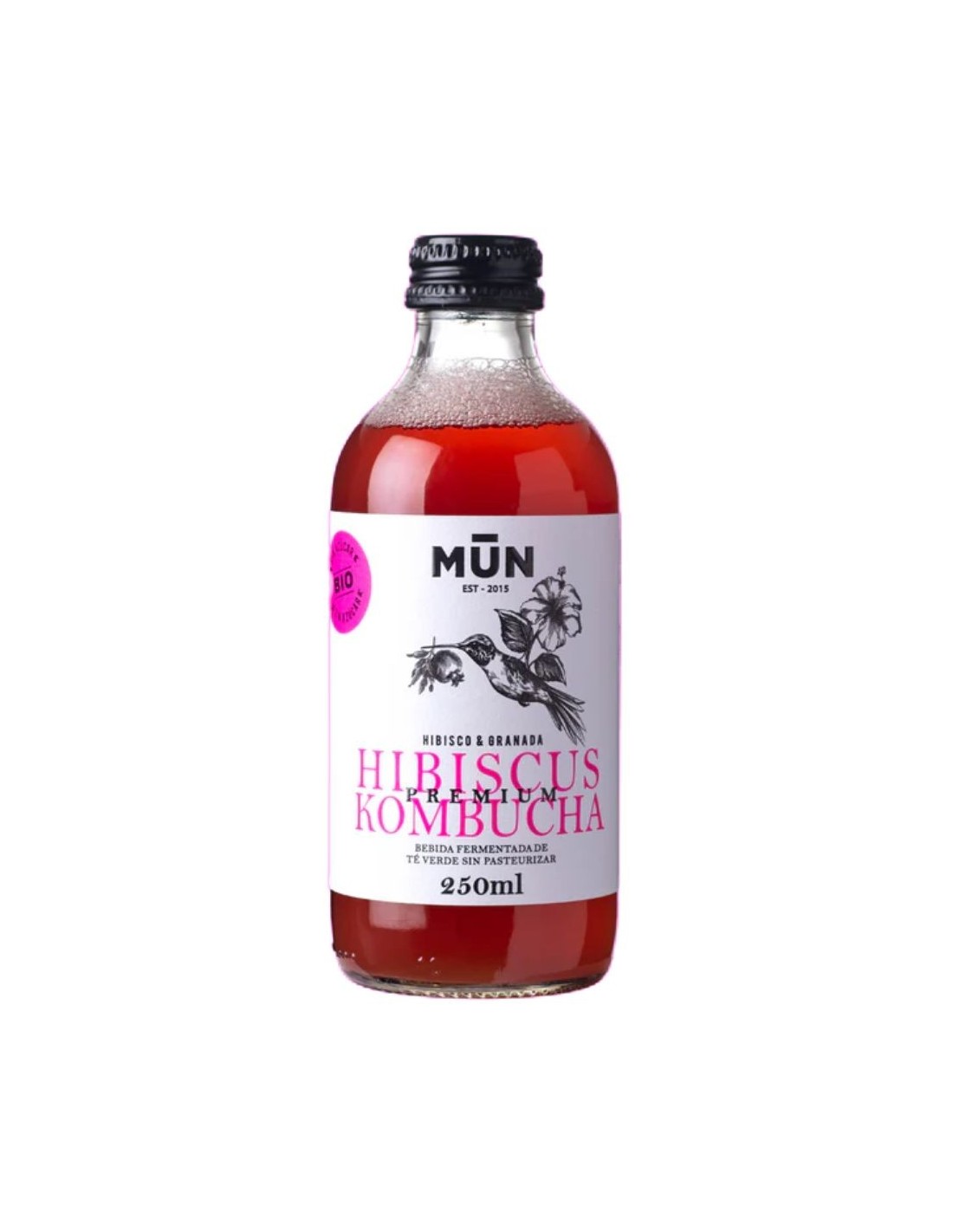 Mun Kombucha Hibiscus Bio Kombucha Thee (250 ml) is een ambachtelijk gefermenteerde drank, gemaakt met biologische ingrediënten en zonder pasteurisatie- of filterprocessen, wat het behoud van de natuurlijke probiotica en alle heilzame eigenschappen garandeert.
