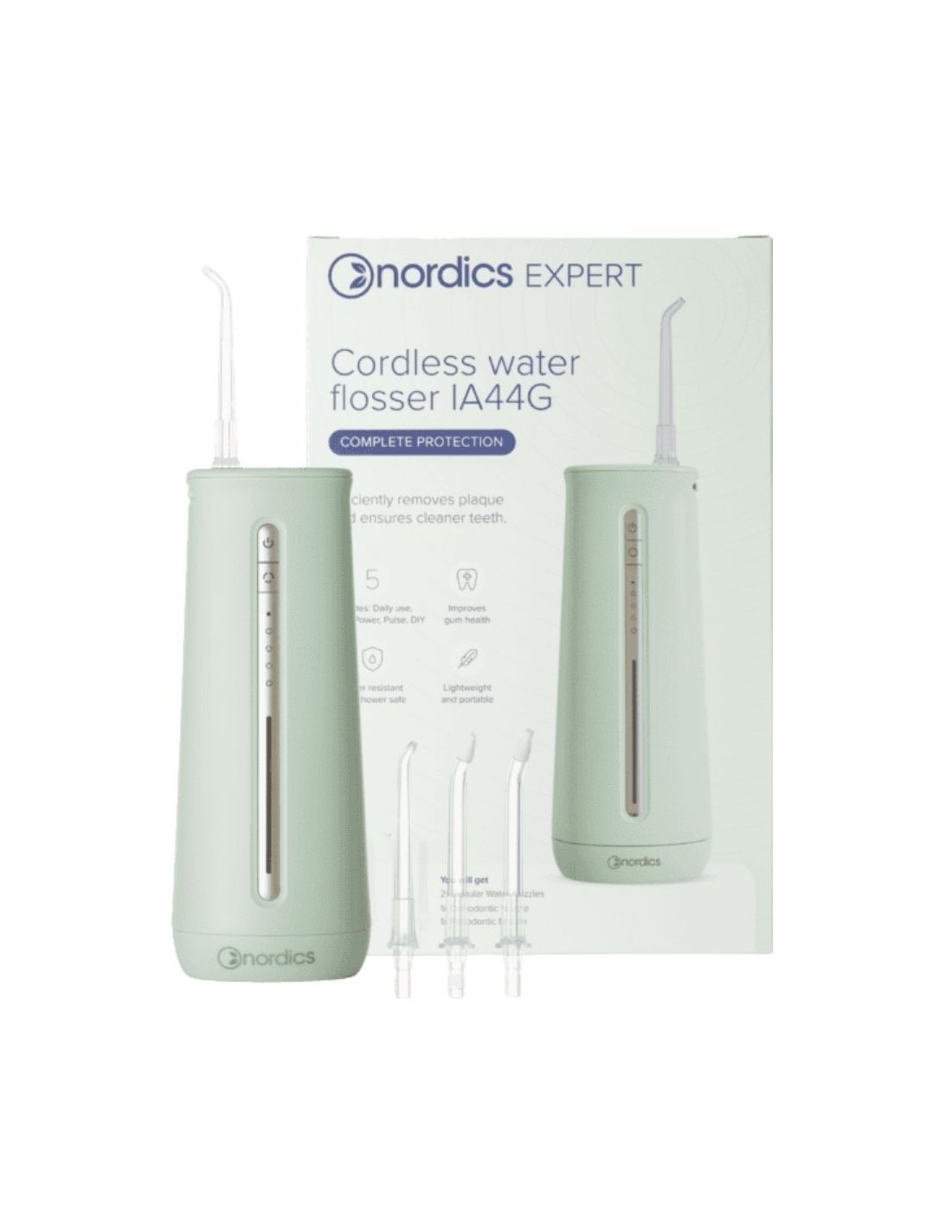 O Irrigador Oral Green Expert da Nordics Oral Care oferece uma limpeza interdentária profunda com cinco modos de pressão, um design sem fios e quatro bicos especializados, ideais para melhorar a saúde das gengivas e remover eficazmente a placa bacteriana.