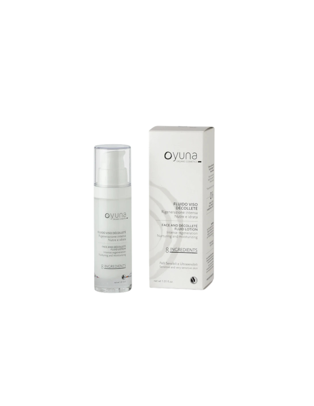 Oyuna fluido rosto e decote 30 ml: tratamento orgânico com uma textura leve formulado com até 8 ingredientes para peles sensíveis. Contém óleo de ameixa, ácido hialurónico e zinco.
